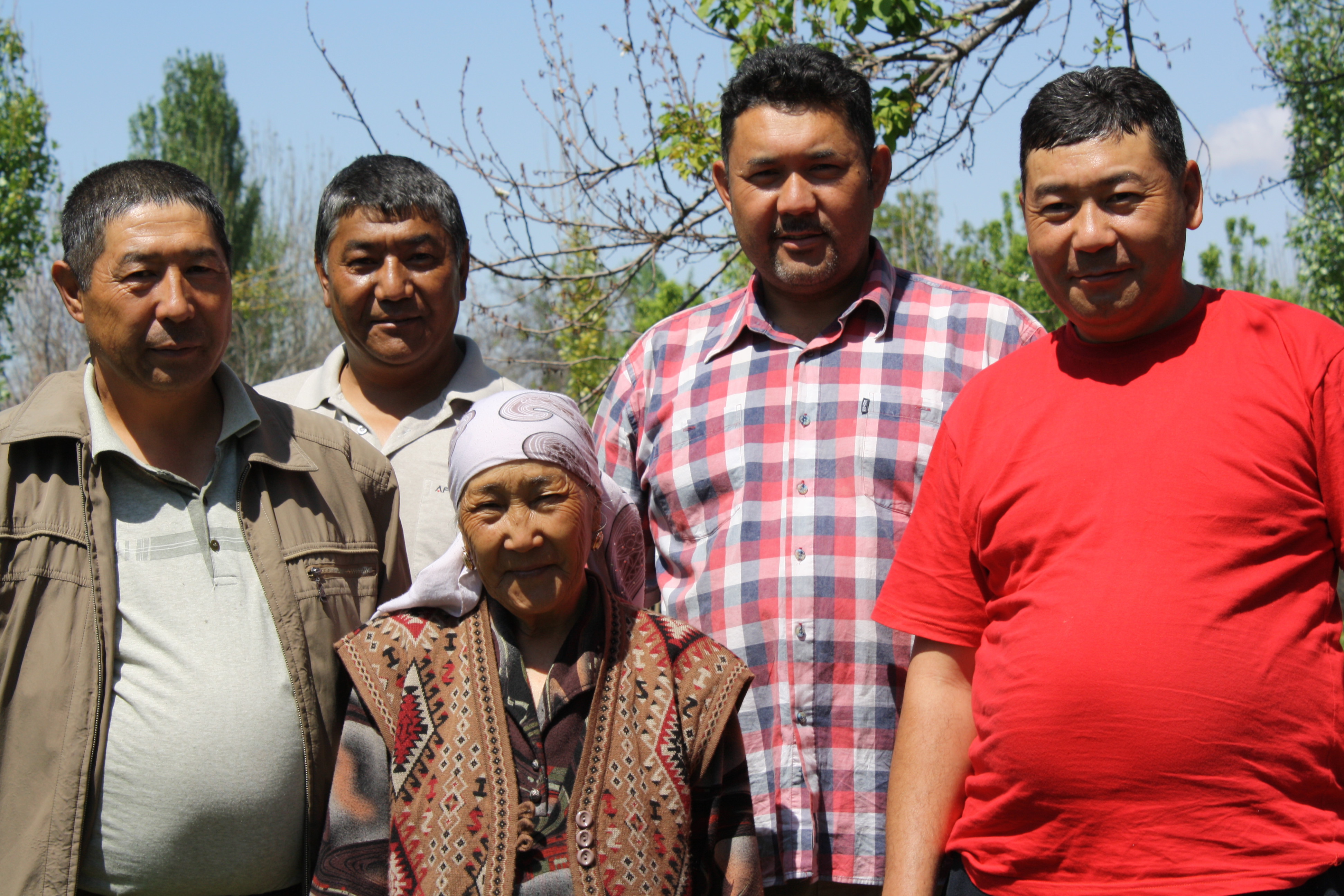Кундуз апа со своими сыновьями-богатырями: Максат, Бакыт, Совет, Канат (слева направо)
