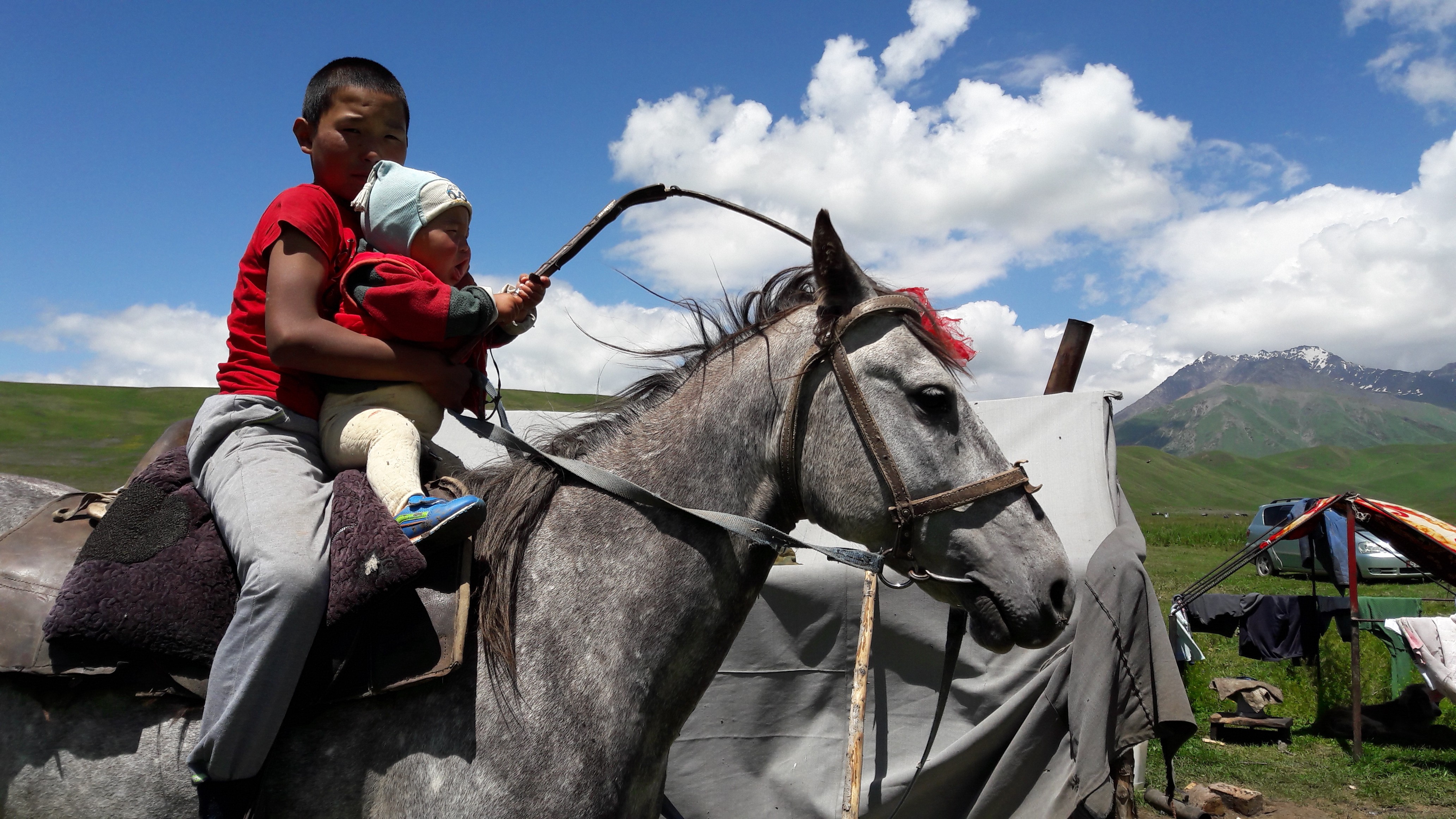 Вот как Вы передвигаетесь с детьми по городу? На маршрутке, на машине, на автобусе, на велосипеде, пешочком? А малыши на жайлоо рассекают зеленые межгорные участки верхом на коне. Это их главный транспорт. И ни крема солнцезащитного им не надо, и воды брать с собой не надо. Они пьют талую воду от ледников. Садятся верхом и скачут.